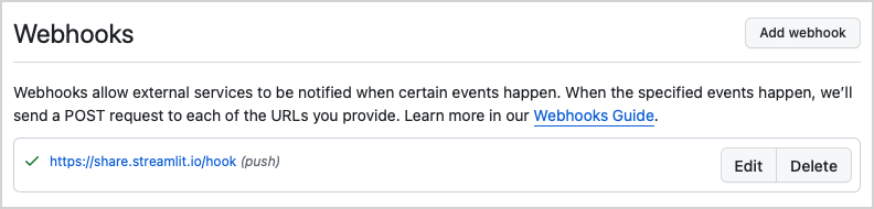 When you connect a GitHub repository to a Community Cloud deployment, Streamlit sets a web hook on the repository. Any time you push changes to the branch that the deployment is pulling from, Streamlit gets a notification and automatically updates the deployed project.