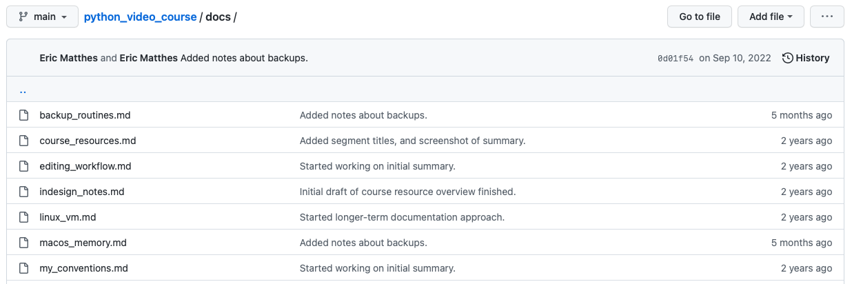 You also don’t need anything complex to get started with this kind of documentation. Make a new folder called my_docs/ in your project, make a single file called initial_documentation.md or README.md, and dump what you know about the project into that file. This will be really useful when you come back to the project, and makes it much easier to start writing formal documentation whenever it becomes appropriate for the project. This kind of information is also the first information you’d want to share if you get to a point where you want to open your project to potential collaborators.