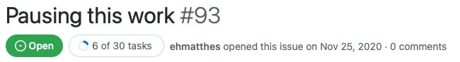 I’m a huge fan of GitHub’s issues. I know there are more complex ways to manage larger projects, but I’ve found a simple set of issues to be a really good way to capture my thinking around a project as it’s evolving. The following steps can give you a set of issues that make it easier to maintain your current state of focus on a project, and make it easier to resume work later when you inevitably get interrupted: